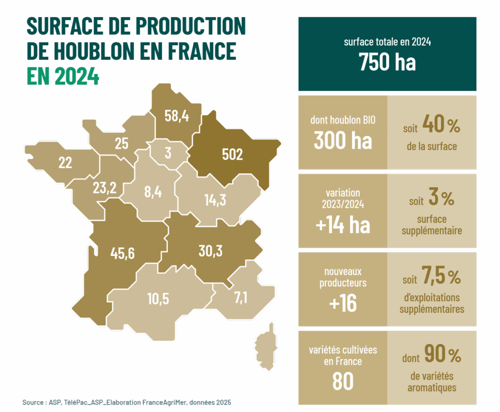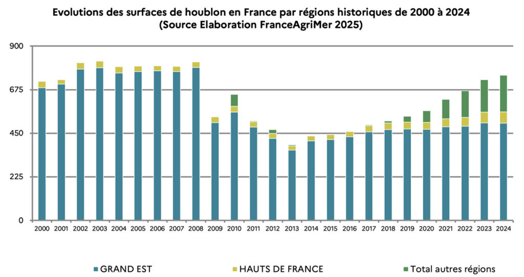 Depuis 2008, la culture du houblon en France a connu des transformations significatives, marquées par des périodes de baisse de la production pour connaitre une surface de production de 390 ha au plus bas en 2013. Les 750ha recensés en 2024 par FranceAgriMer représente une augmentation de 92 % en plus de 10 ans. En 2013, presque 100% de la surface de houblon était concentrée sur les deux régions historiques Grand Est (93 %) et un peu plus de 6 % pour la région Hauts-de-France. En 2024, les régions historiques représentent 75 % des surfaces françaises et 25% pour les autres régions françaises. Cette tendance a commencé à s’observer à partir de 2018 jusqu’à aujourd’hui où l’on trouve du houblon dans toutes les régions de France métropolitaine.