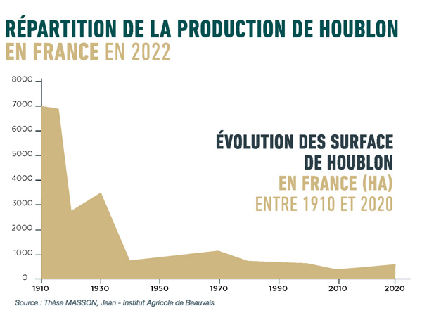 Quant au houblon qui est cultivé dans différentes régions de notre beau pays, tout est à faire (…). » Au moment où il écrit sa thèse, la France est en guerre contre l’Allemagne. L’Alsace est déjà considérée comme un prestataire de qualité. La surface totale en équivalent France d’aujourd’hui (France de l’époque plus Alsace) est alors de 6 944 ha répartis dans plusieurs régions de France. L’Alsace représente à cette période plus de 58 %, suivie par le Nord, la Côte d’Or et la Lorraine.