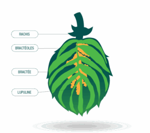 La fleur de houblon, qui est un cône, est composée de bractées sous lesquelles sont présentes, à leurs bases les glandes à lupuline qui sont une résine farineuse de couleur jaune. Cette substance est un principe actif qui, durant le brassage, va libérer les composés notamment responsables de la saveur amère.